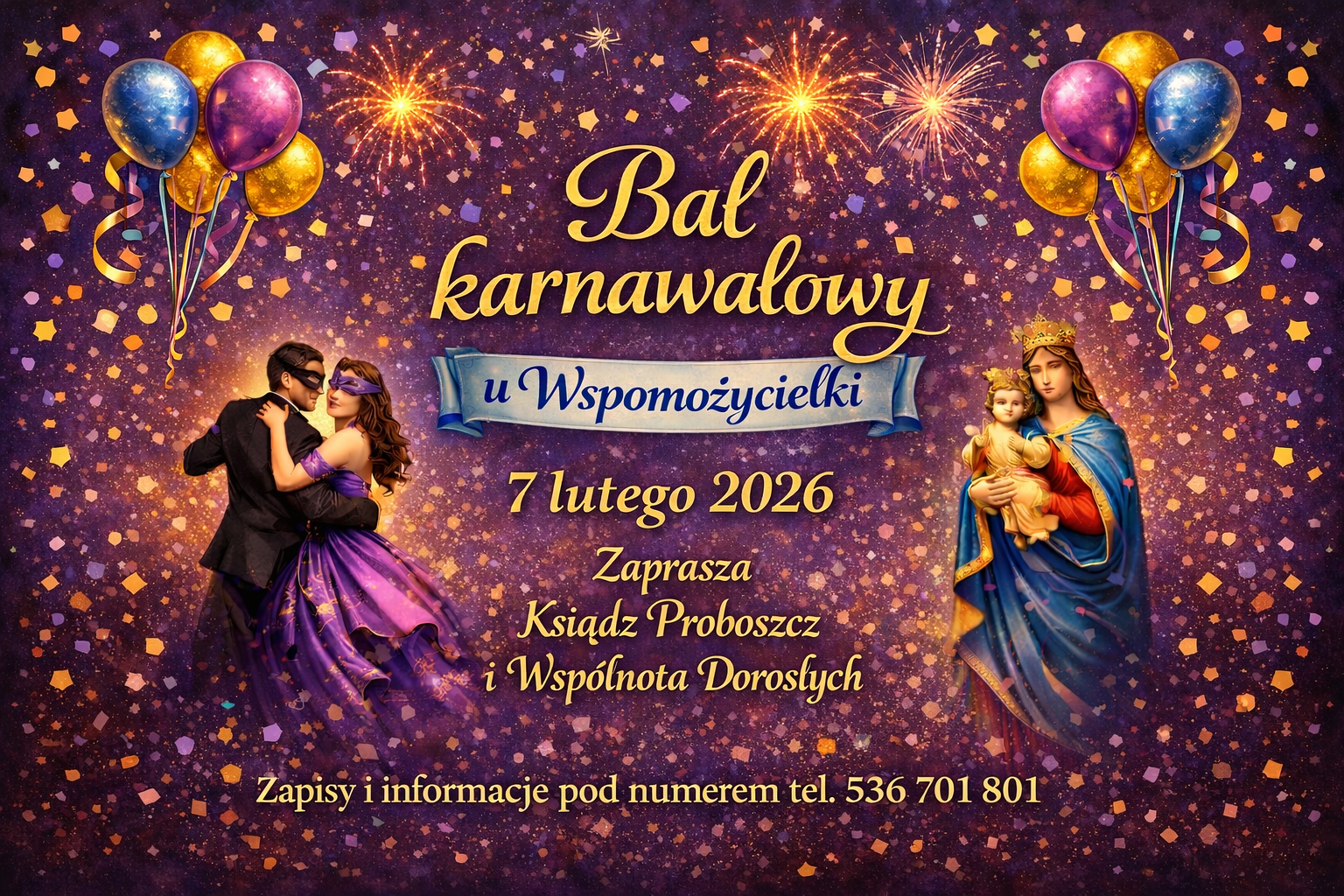 5/ Chętnych zapraszamy na parafialny bal karnawałowy. Bal odbędzie się w sobotę, 7 lutego o godzinie 19:00. Liczba miejsc ograniczona. Informacja o zapisach w zakrystii i na stronie parafialnej.